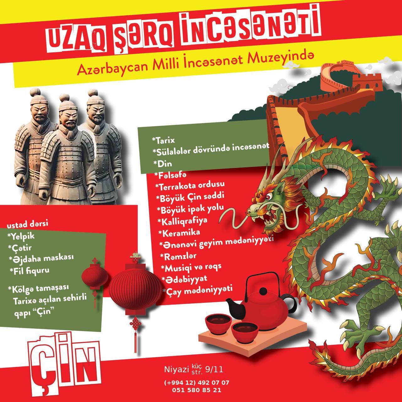 Eyni zamanda onlar Çin incəsənətinin sehrli dünyasına qərq olacaq, qədim memarlığın möhtəşəm nümunəsi sayılan Çin səddi və digər məşhur abidələr, heykəltaraşlıq, rəssamlıq, keramika və kalliqrafiya sənəti, o cümlədən ədəbiyyat, musiqi, ənənəvi geyim və çay mədəniyyəti haqqında mühazirəni dinləyəcəklər.