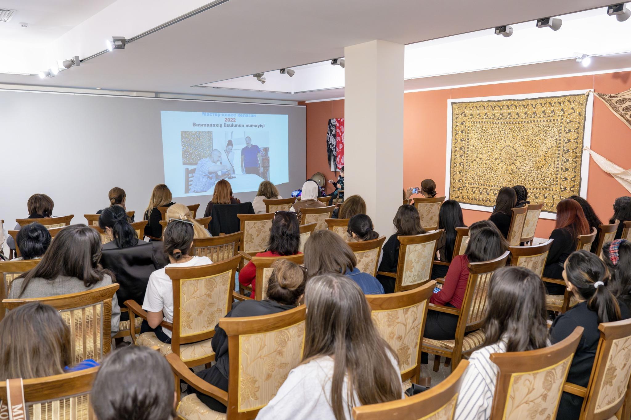 Professor, fəlsəfə doktoru Rəna İbrahimbəyova qədim xalq sənəti olan kələğayı haqqında mühazirə ilə çıxış edərək onun tarixi inkişafı, simvolik məzmunu və ənənəvi ornamentlərinin semantikası haqqında geniş məlumat verib.